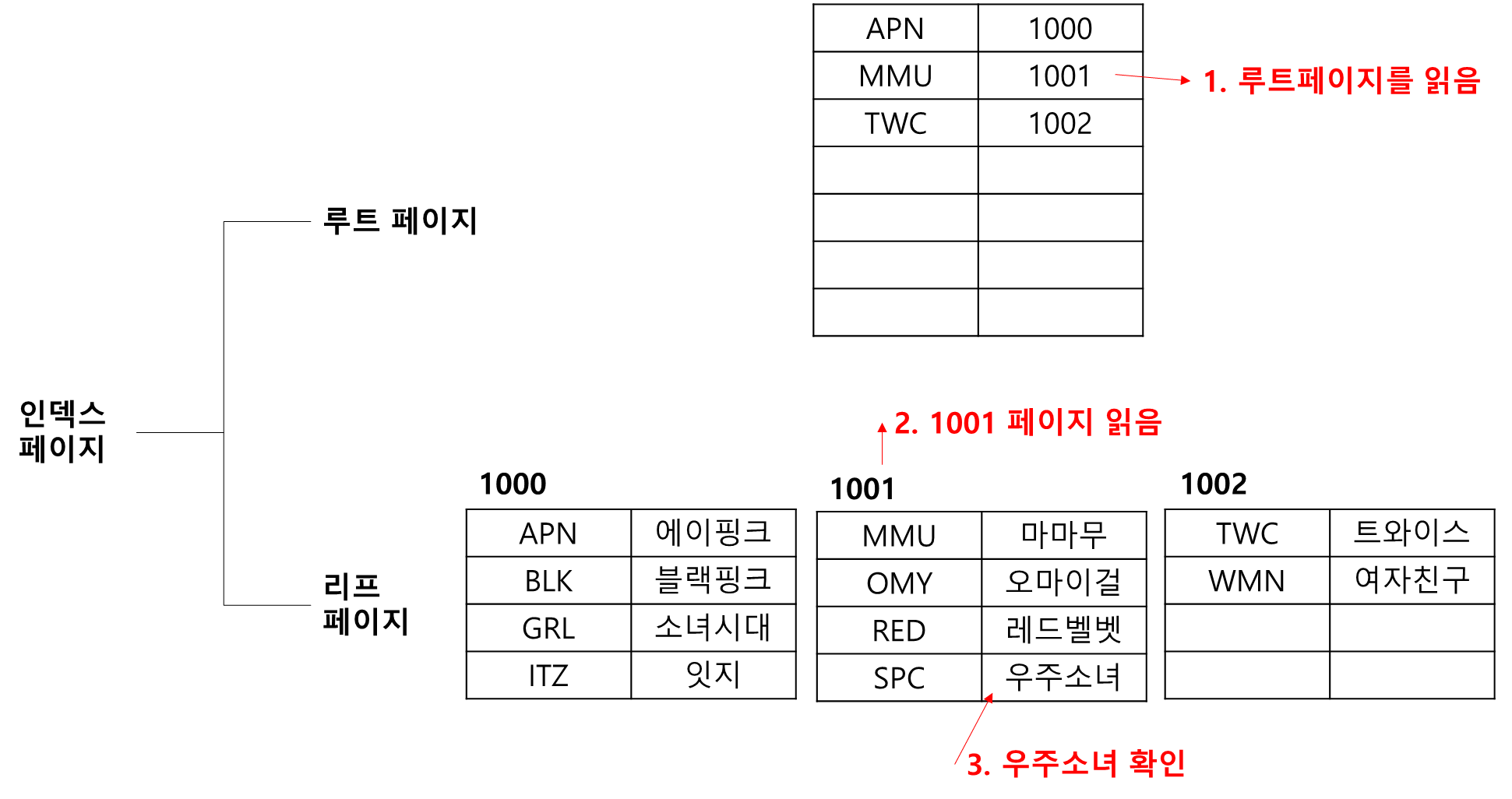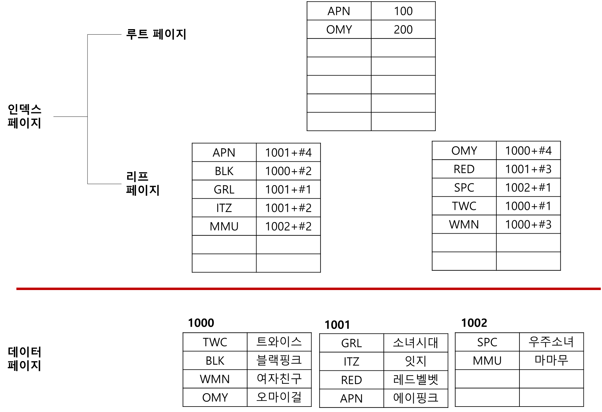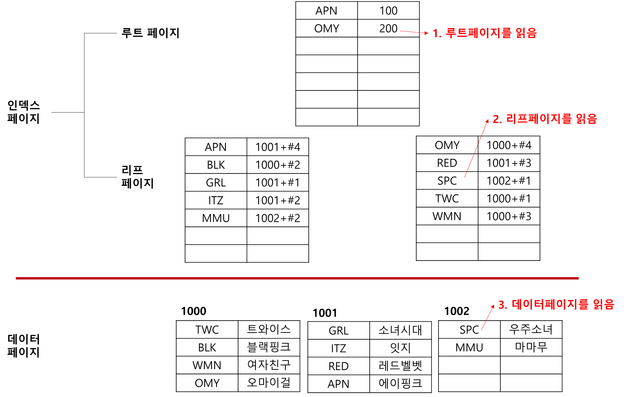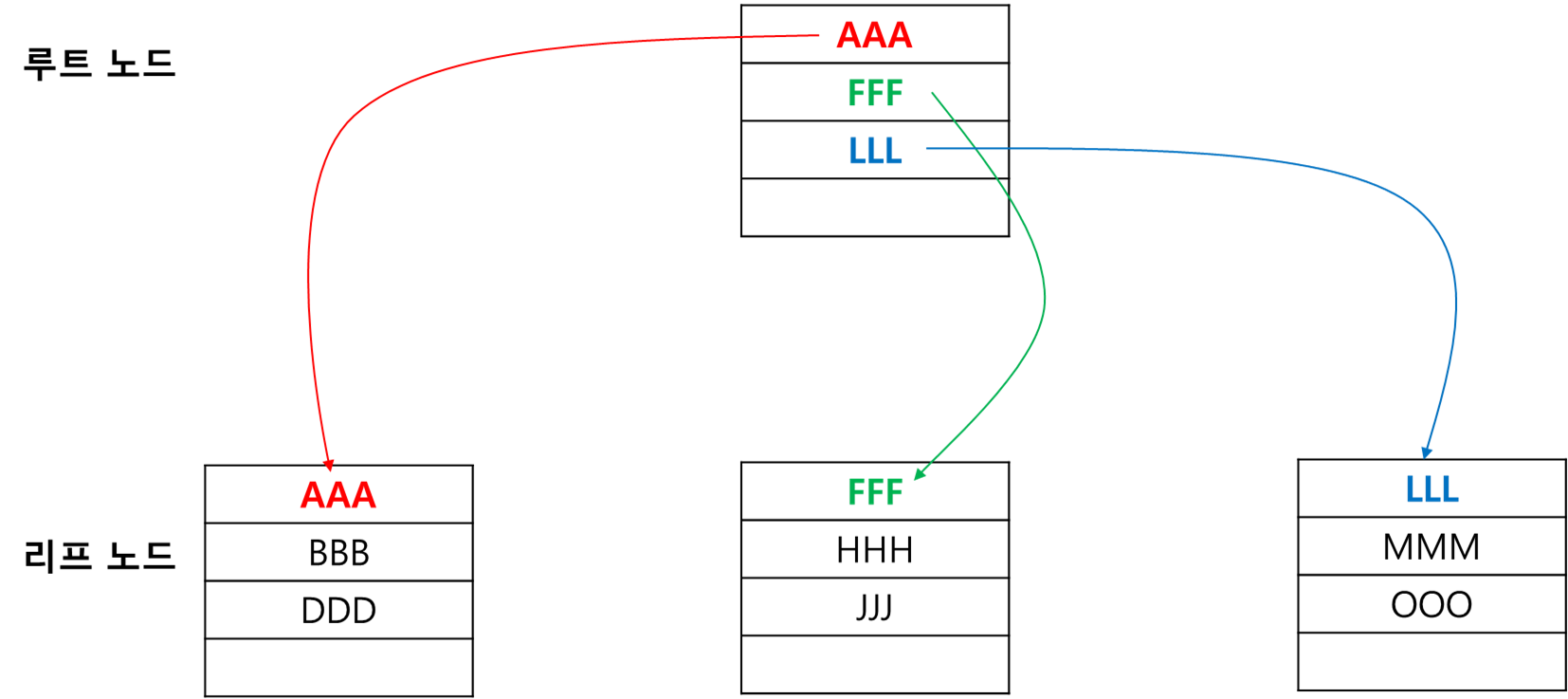 하지마 인덱스(균형트리)가 설정되어 있다면 루트 페이지에서 AAA, FFF, LLL을 거쳐 리프 노드의 LLL, MMM을 거쳐 더 빠르게 찾을 수 있다