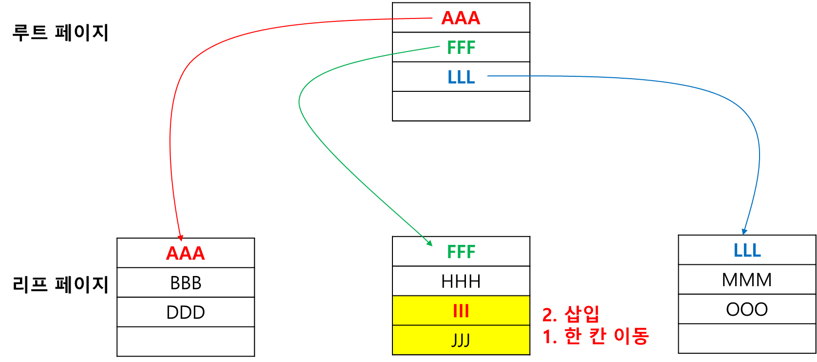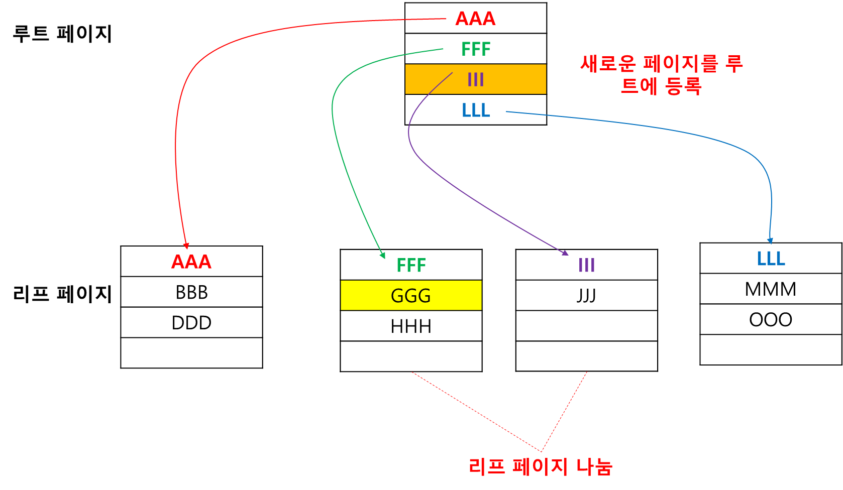 이번에는 GGG를 입력해 보자. -GGG를 넣기 위해서는 리프에 페이지 공간이 부족하여 새로운 페이지를 만들어야 한다. -새로운 페이지가 생성되면 이를 루프페이지에도 등록해줘야 한다.