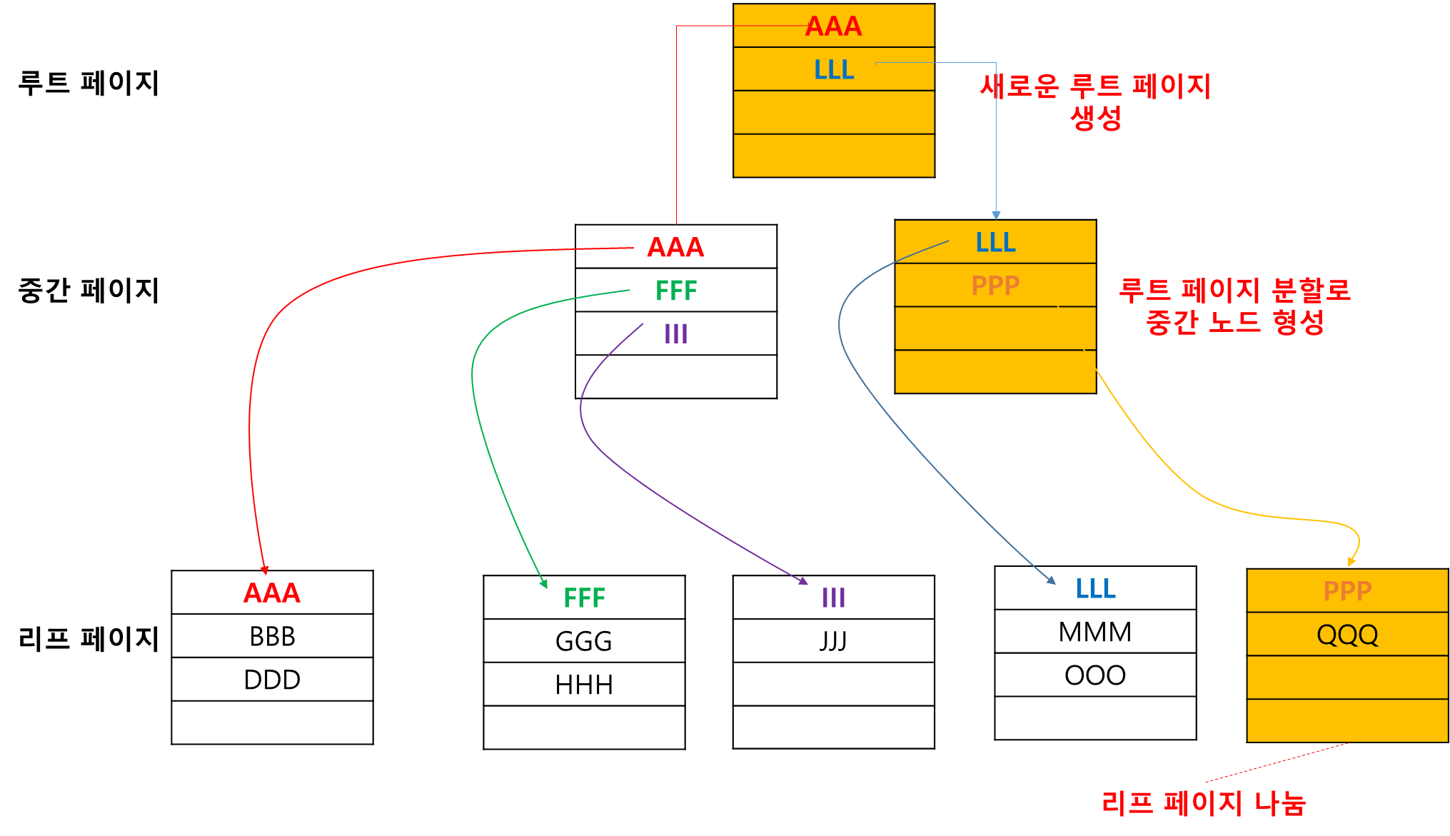 이번에는 PPP, QQQ를 두개 연속 입력해 보자. -PPP는 4번째 리프 페이지에 입력된다. -QQQ는 4번째 리프 페이지에 공간이 없으므로 리프 페이지가 추가된다. -루트 페이지에도 공간이 없으므로 페이지 분할이 일어나며 이것은 중간 페이지로 변경된다. -새로운 루트 페이지가 추가된다.
